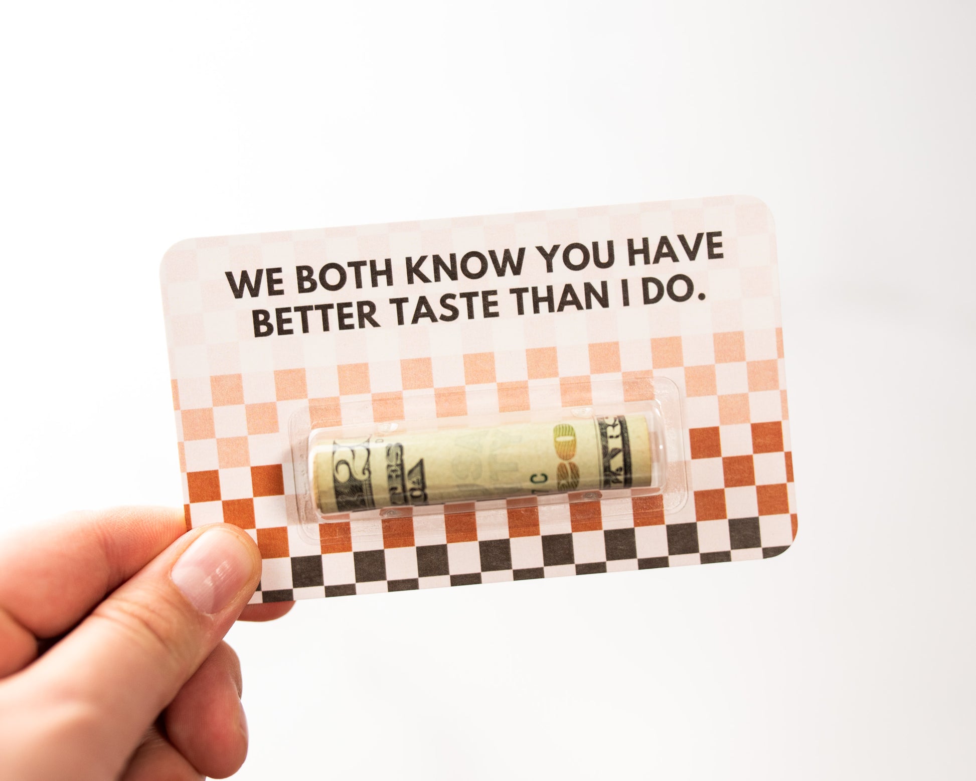 This money holder card has a boho checkerboard background and says, "We both know you have better taste than I do." The recipient will be flattered, no gift receipts will be needed, you'll get all the credit for this clever teen money gift.