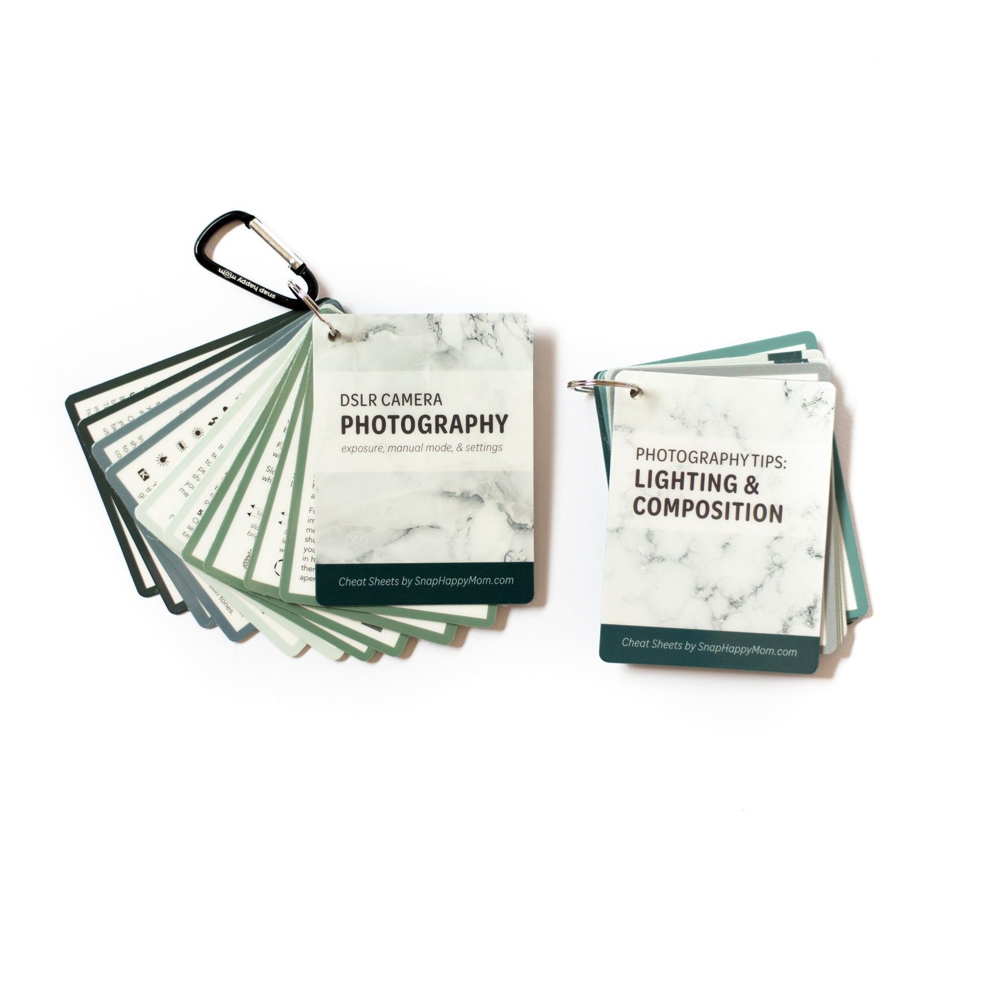 Each deck includes 11 double-sided plastic cards, intended as reference cards for your camera bag or on-the-go. The deck is comfortable in your hand, small enough to fit in your back pocket, and has a handy ring to keep everything together. The cards are all professionally printed on smooth, durable plastic so that they can be hung on your camera bag and withstand years of use.