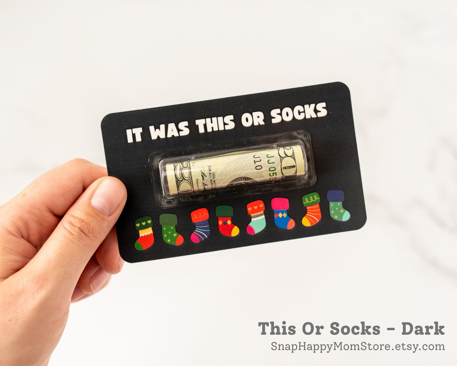 It has a dark background with different colored stockings across the top. The words say, "It was this or socks." Your teens will get a good laugh and appreciate the cash gift.