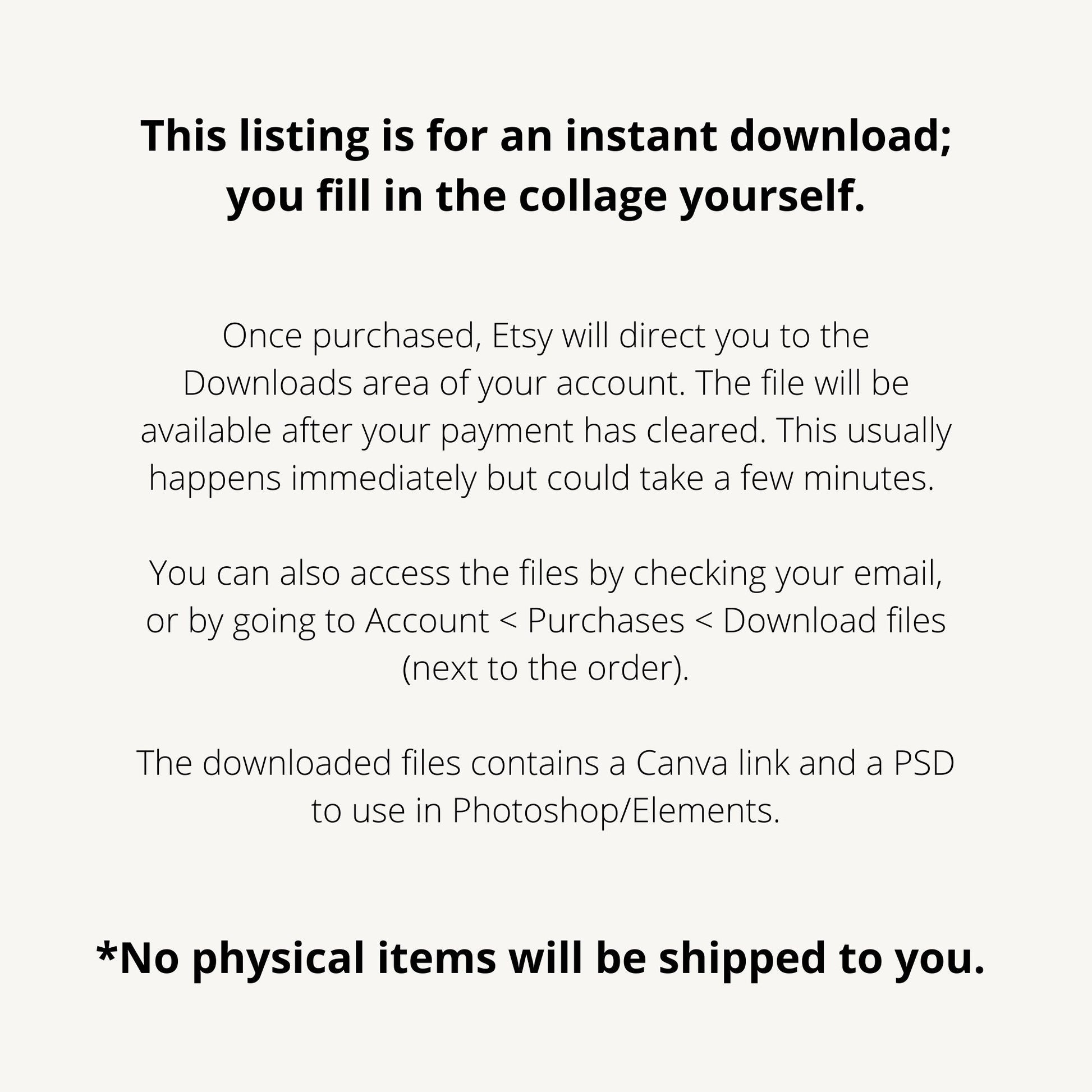 Canva users: The download contains a PDF file instruction file with the template link. Click the link to go to Canva.com and edit the collage online (nothing to install!) or use their free mobile app. Helpful Canva instructions are included.