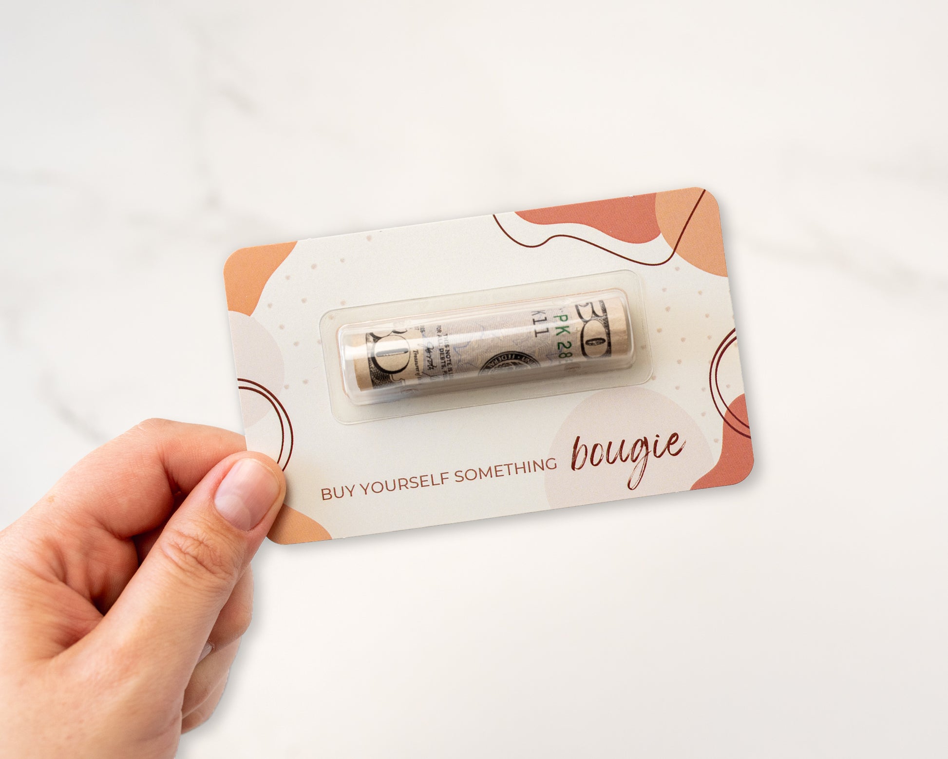 Not sure how to pamper your teen daughter? Gift them this money card holder! It has a pretty background featuring different shapes and lines of various shades of brown. The text says, "Buy yourself something bougie."