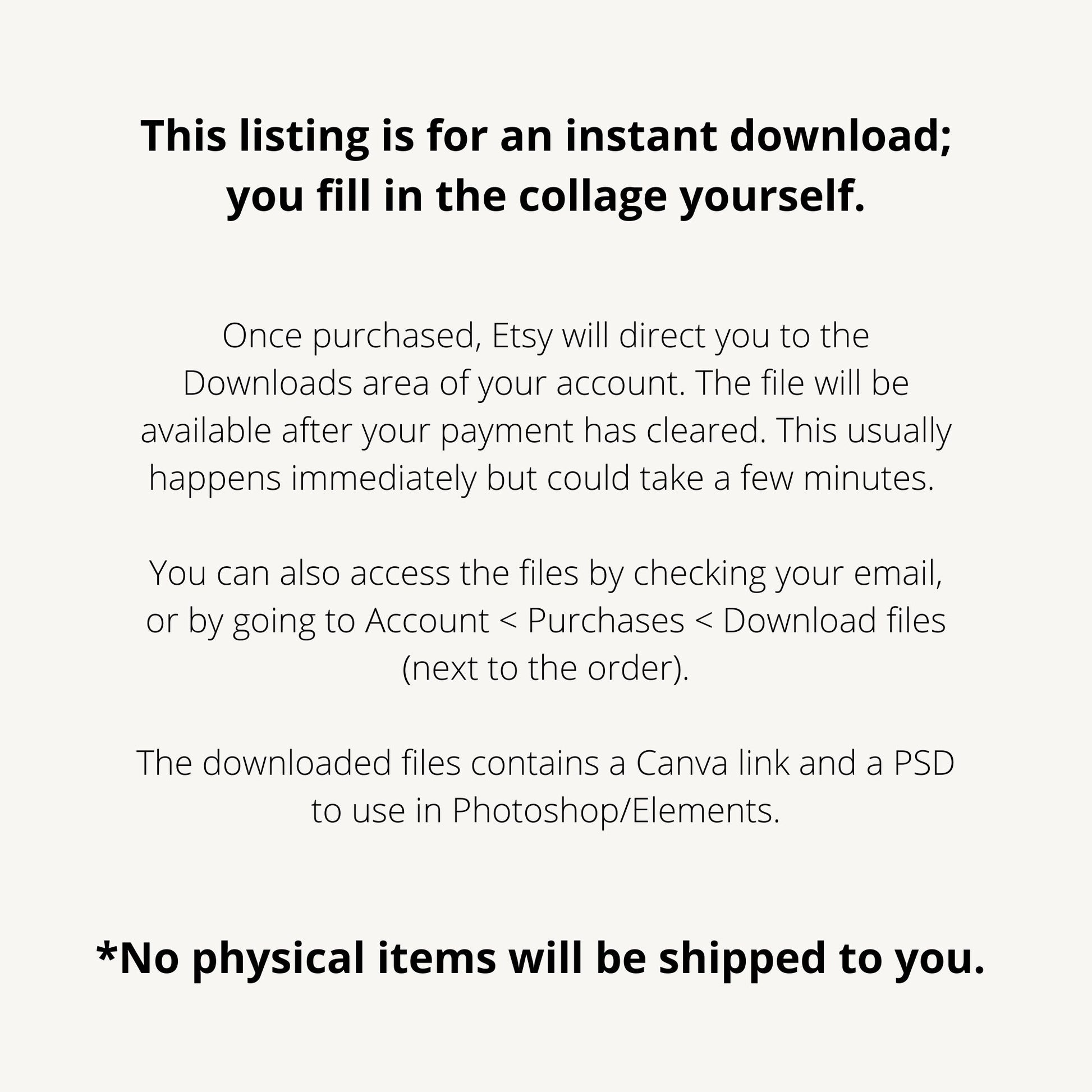 Canva users: The download contains a PDF file instruction file with the template link. Click the link to go to Canva.com and edit the collage online (nothing to install!) or use their free mobile app. Helpful Canva instructions are included.